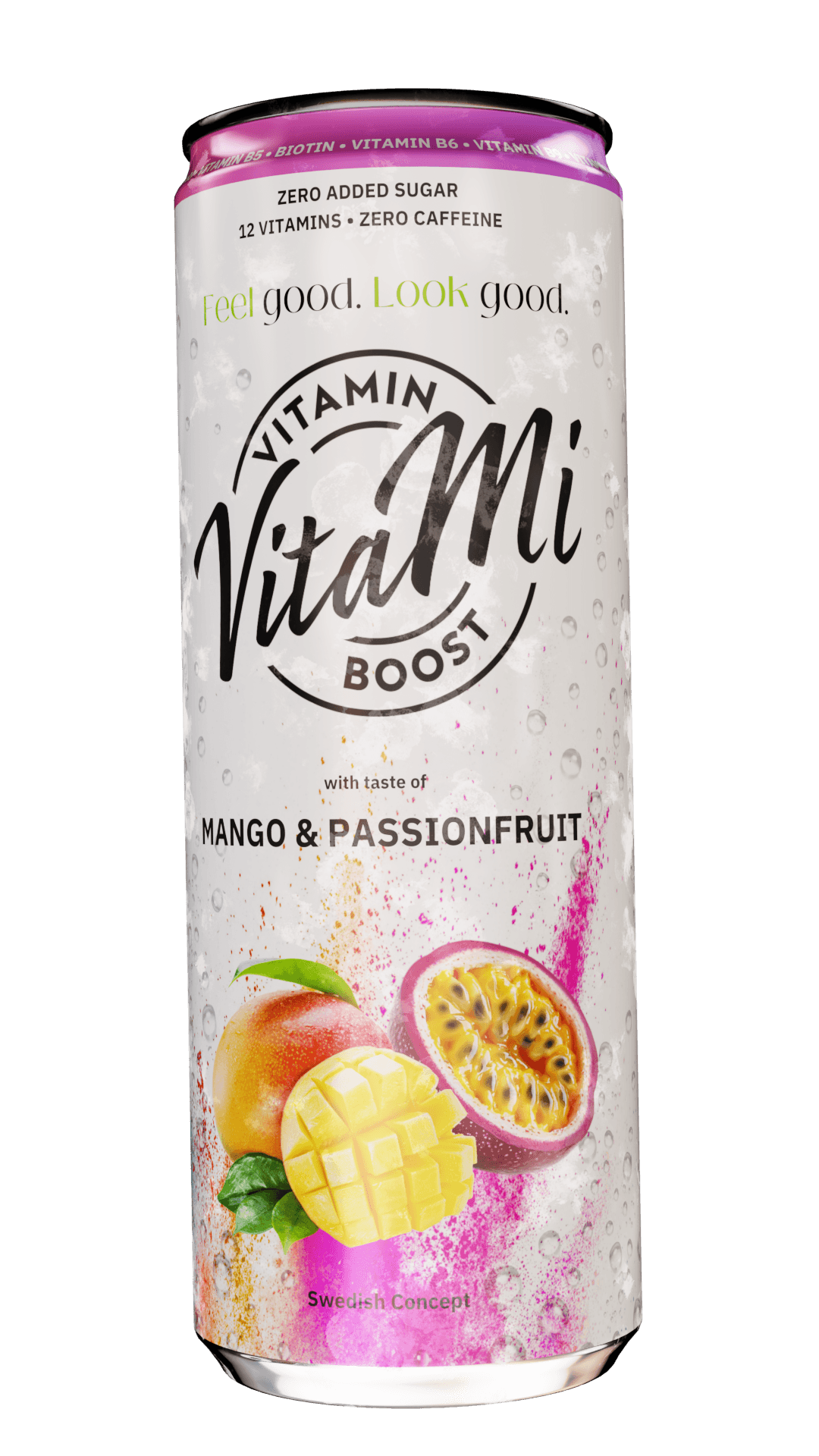 Kolsyrad funktionsdryck med smak av mango och passionsfrukt. Socker-och koffeinfritt. Innehåller sötningsmedel.